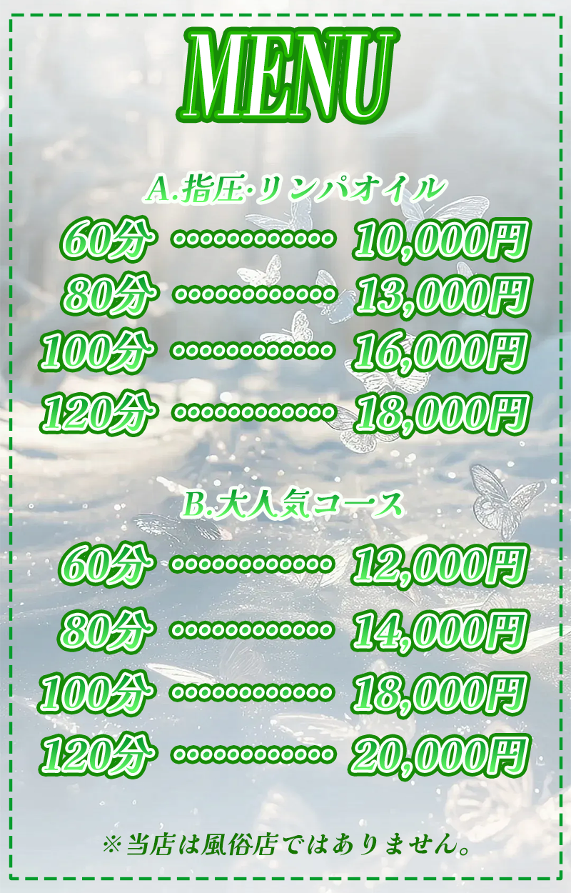 毎日頑張っている紳士の皆様、日頃の疲れになっている身体と心を、幸福なる雰囲気包まれた癒しの場所、落ちついた部屋の個室で可愛いセラピスト達がお待ちしております。当店のセラピストは若く容姿端麗にこだわりました、まるで蜜のように甘く幸せな空間でゆったりとした時間をお過ごし下さい。